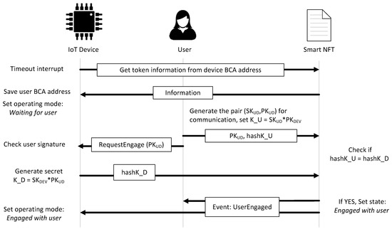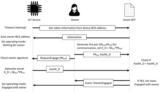 When the smart NFT is created, the operating mode of the device defined in the state is Waiting for owner. If the state is Waiting for owner, the device saves in its memory the owner BCA address. Since devices, owners, and users agree on the elliptic curve employed (secp256k1 in Ethereum) and the primitive element used on this curve, the owner generates a pair of keys, a private key () and a public key (), which verify that . The owner proposes as secret to share with the device to establish a secure communication channel. The owner publishes as dataEngagement and the hash of as hashK_O with the function startOwnerEngagement. The owner requests the device to finish engagement. The device validates the owner request, generates its secret as , using the public data , and sends the hash of as hashK_D with the function OwnerEngagement. If everything is correctly done, and are the same since