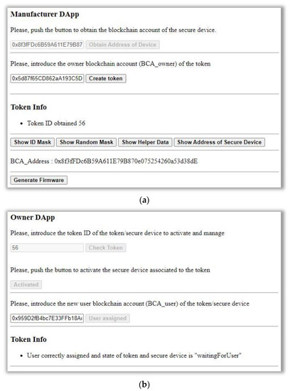 The manufacturer DApp is the one used by the manufacturer to upload, in the IoT device, the firmware needed for the device registration process. This firmware carries out the creation of the IDMASK and RNDMASK, the helper data HDDEV, and the BCA of the device. The DApp creates a UART connection with the IoT Device to obtain this information. In addition, in the token creation process of the smart contract, the DApp obtains the tokenId and registers the token in the blockchain with an owner. With all this information, the manufacturer DApp creates the firmware FWBC of the device and uploads the OSMAN with the FWBC into the device.