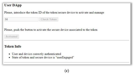 The user DApp is used for the mutual authentication between the user and the IoT device, similarly to the mutual authentication with the owner DApp. This DApp makes the smart contract execute the startUserEngagement function to start the engagement. Once the user is engaged (the event UserEngaged is received), this DApp allows uploading the SWUSER into the device. Figure 8 illustrates these DApp interfaces.