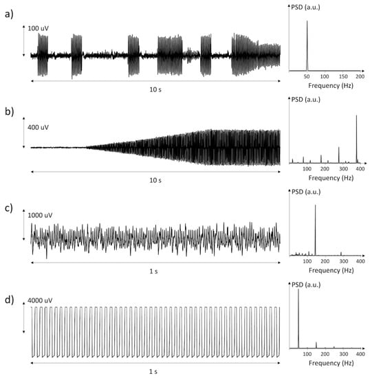 Three examples (a–c) of power line interference generated by disturbing equipment or loss of electrode–skin contact and one example (d) of saturation of the amplifier likely due to loss of electrode–skin contact.