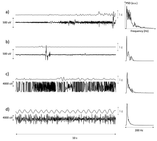 Time plots of the modulus of the acceleration of the EMG sensor and of the associated sEMG with its power spectrum. (a,b) are examples of occasional movement artifacts. (c) is an example of loss of electrode–skin contact(s) during movement. (d) is an example of passive movement of the arm during treatment.