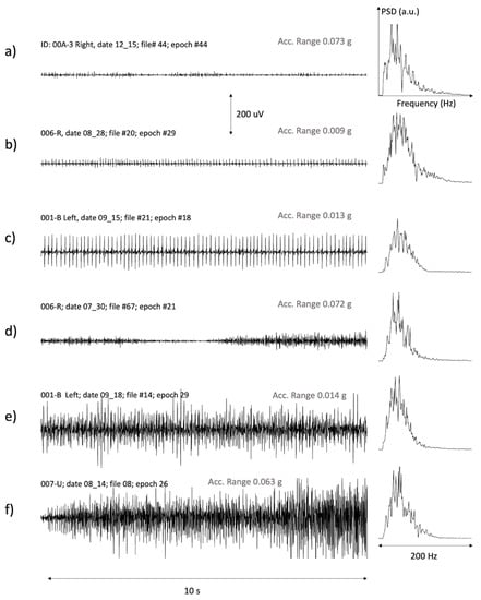 The variability in sEMG characteristics is evident in Figure 4. We observed trains of single or a few MUs of different amplitudes. Examples are given in Figure 4a–c. We also observed epochs with MU recruitment and derecruitment, as shown in (d). Finally, we observed periods with prolonged interferential activity and different amplitudes, as in the cases (e) and (f). Three of these epochs (b, c and e) had a range of the acceleration modulus lower than the threshold of 30 × 10−3 g, and were therefore classified as IMA (see Methods). The remaining epochs had an acceleration slightly greater than this threshold and were therefore not classified as IMA.