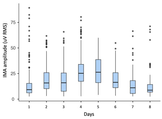 In the sample, IMA RMS amplitude was on average 21 (16) mV and varied between 3 and 153 mV. Peak-to-peak IMA amplitude was on average 225 (171) mV and varied between 21 and 1894 mV. IMA variability within a single day and between days is shown for one subject (ID 008-Xr) in Figure 5. The single day variability is shown in the spread of a single box-plot. The between days variability is clearly visible when comparing consecutive boxplots.