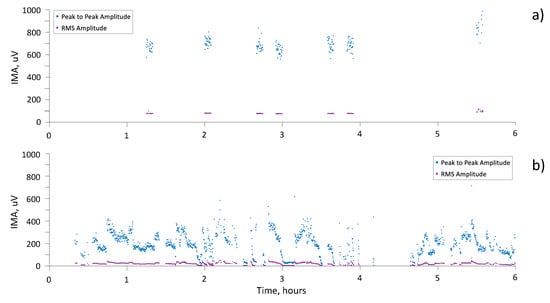 Peak-to-peak (blue dots) and RMS (purple dots) amplitude of IMA during 6 h of recording for (a) subject 002-E and (b) subject 001-Br.
