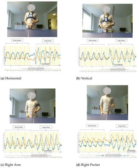 For the arm and pocket, the right side was initially selected because the participant was right-handed. Sets of data were collected with these four positions and compared visually by the research team using the Visual Inspection Tool (VIT) [30] (VIT—https://github.com/dimstudio/visual-inspection-tool, last accessed on 25 March 2021), an existing annotation toolkit, by observing the data plots from the time series to explore the similarity in terms of patterns when the participant performs the strokes. The visualised results for this study are shown in Figure 1.