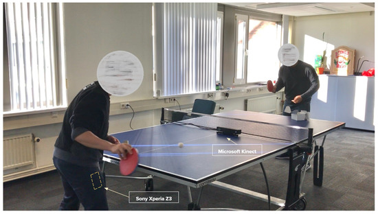 In a high-quality training facility, such sessions are supported by sports training technologies that use expensive sensors and equipment, which are unavailable to the general population. However, smartphone devices, which are widely available for the general population, are equipped with high-tech sensors, such as the accelerometer and gyroscope that can collect data in real time. These sensors in smartphone devices can be used to measure and monitor body motion to provide feedback during table tennis practice and, therefore, can be potentially used for training [7,8,9]. The majority of smartphone devices have built-in sensors that measure acceleration, orientation, and various environmental conditions. These sensors provide raw data with high precision and accuracy. In addition, they are also capable of monitoring three-dimensional device movement or positioning or monitoring changes in the ambient environment (Android Sensors Overview—https://developer.android.com/guide/topics/sensors/sensors_overview, last accessed on 20 March 2021). Data from smartphones have been used to predict human activities such as movement [10,11] and fall detection [12]. Another external sensor used for training psychomotor skills is Microsoft Kinect [13,14,15]. The Kinect is an external infrared sensor that is used to track skeletal points of the human body and their movements, which can also be useful in the case of table tennis. These aforementioned devices can be used simultaneously, enabling the collection and analysis of the multimodal data for providing feedback during table tennis training.