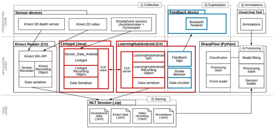 In the psychomotor domain, motion sensors such as accelerometers and gyroscopes are predominantly used for the acquisition of motion data to recognise human activities. Pereira dos Santos et al. [8] emphasise the importance of combining motion sensors to obtain higher accuracy in detecting not only simple but complex activities as well. Combining these sensors enables the collection of multimodal data and, therefore, a more accurate representation of the learning process [16]. The collection of multimodal data can be done using various types of sensors such as wearable sensors, depth cameras, Internet of Things devices, computer logs, etc. Moreover, these sensors are typically synchronised with human activities so that one can analyse historical evidence of learning activities and the description of the learning process [23]. Limbu et al. [6] developed the “Calligraphy Tutor”, which uses Pen sensors in Microsoft Surface and EMG sensors in Myo (Myo sensor armband—https://www.rs-online.com/designspark/expanding-gesture-control-with-the-myo, last accessed on 25 March 2021) sensor armband to provide feedback to learners during practice. It also allows the calligraphy teacher to create an expert model, which the learners can later use to practice and receive guidance and feedback based on the expert model. Similarly, Schneider et al. [24] also designed a system to support the development of public speaking skills. The system uses the Microsoft Kinect v2 (Kinect v2—https://docs.depthkit.tv/docs/kinect-for-windows-v2, last accessed on 25 March 2021.) depth camera sensor that is placed in front of the learner to track the skeletal joints of the learner’s body, along with a microphone, while presenting and provide real-time feedback based on common public speaking mistakes such as facial expressions, body posture, voice volume, gestures, and pauses.