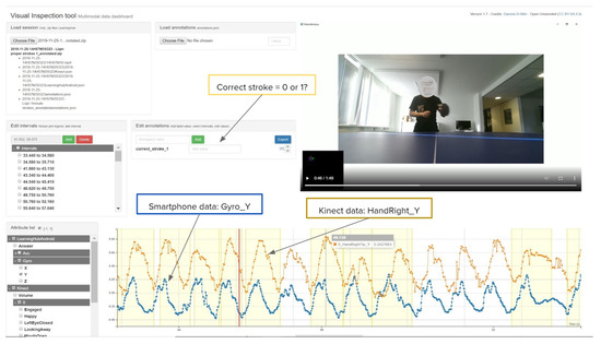 Figure 4 shows the screenshot of the VIT used for the detection of strokes in a single session. For each of the 33 sessions recorded, the annotation file was loaded and synchronised manually with the guidance of the sensor data plots and the video recordings. We added the time-intervals to portions of sensor recordings. We used the binary classification approach, where either the stroke is correctly executed (Class 1) or incorrectly executed (Class 0) as labels for the machine learning classification (see Listing 3. Thus, a total number of 510 strokes (260 short strokes + 250 long strokes) were annotated. Subsequently, we downloaded the annotated sessions with the exclusion of the video files, which are vital for the next step, the analysis of data for the classification of strokes.