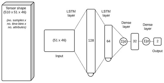 - a first LSTM with input shape 51 × 46 (#intervals × #attributes) and 128 hidden units;