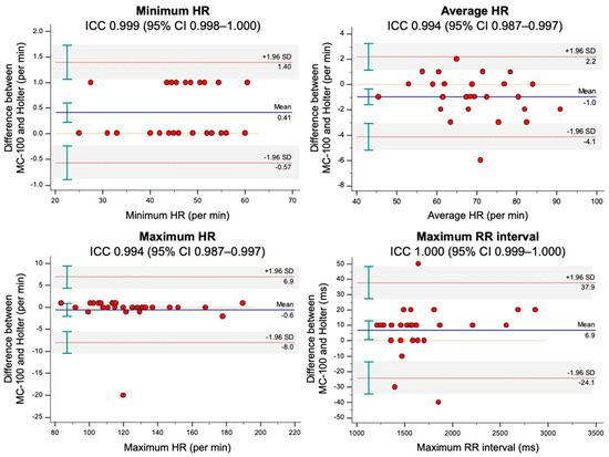 The Bland–Altman plots for ECG parameters, including minimum/average/maximum HR and maximum RR interval. The plots drew with 95% CI of limits of agreement and 95% CI of mean difference. The mobiCARE-MC100 served as a reference. Abbreviations: CI, confidence interval; ECG, electrocardiogram; HR, heart rate; ICC, intraclass correlation coefficient; SD, standard deviation.