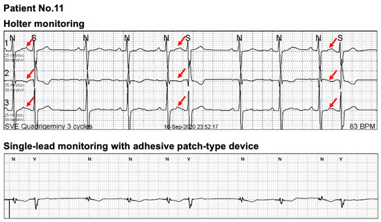 The P-wave axis was different among the participants; therefore, some P-waves were not clearly recognizable in the single-lead ECG monitoring. In Figure 4, the participant had PACs with aberrant conduction (red arrows) during Holter monitoring. However, the aberrant conduction was less clear in this participant because the P-waves were unclear in the single-lead ECG monitoring. Therefore, for patients with P-waves of low amplitudes, a compensatory pause should be considered in addition to the change in QRS morphology when judging a premature ventricular complex or aberrant conduction with single-lead ECG monitoring. Moreover, there was a case that non-conducted PACs could not be recognized. In Figure 5, non-conducted PACs (red arrows) and PACs (blue arrows) were observed in Holter monitoring, whereas P-waves were rarely visible with single-lead monitoring. Compared with the sinus rhythm, the P-wave morphology was different in non-conducted and conducted PACs in Holter monitoring. Therefore, detecting SVEBs with single-lead monitoring mostly depends on evaluating the RR intervals and QRS morphology. As a result, SVEBs may be overestimated with single-lead monitoring than with Holter monitoring in this case.