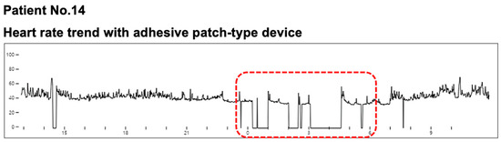 The heart rate trend with adhesive patch-type ECG monitoring device. The raw data from the outlier with significantly higher total QRS complexes with Holter monitoring showed there were significant Bluetooth disconnection periods during the nocturnal period (within the red-rectangled area). Abbreviations: ECG, electrocardiogram.