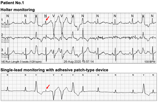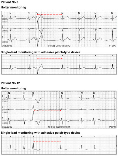 Compared with Holter monitoring or a loop recorder, more convenient noninvasive ECG recording devices have been developed recently with the advancement of wearable technology [12,13,14,15]. Single-lead ECG monitoring has been a favored method to record ECG with handheld or wearable devices that may replace Holter monitoring [16,17,18,19]. An adhesive patch-type ECG monitoring device is easier to use and more capable of recording ECG for an extended period than Holter monitoring [19]. However, such a device has a common disadvantage, in that it can only record the ECG along a single vector. Therefore, a single-lead ECG monitoring device may less accurately measure cardiac electrical activity with a low amplitude, such as P-waves. This issue may become crucial when discriminating cardiac arrhythmias other than atrial fibrillation (AF) because it depends on the appropriate identification of P-waves. There are few reports on head-to-head comparisons of ECG monitoring between an adhesive single-lead device and Holter monitoring among patients with cardiac arrhythmias other than AF. To improve the medical utility of a single-lead ECG device, the diagnostic characteristics of the device should be validated for various cardiac arrhythmias. One of the main hurdles of using a single-lead ECG device in actual clinical practice is a lack of sufficient validation data of a newer device than the previous gold-standard method (i.e., Holter monitoring) [20]. Although there have been several previous studies about diagnostic performance for AF detection using single-lead ECG devices [21,22], a validation study for various arrhythmia other than AF was not sufficient. This study aimed to compare 24 h ECG monitoring between an adhesive single-lead device and Holter monitoring in patients with suspicious arrhythmic episodes other than AF.
