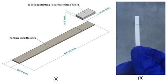 Whatman blotting paper (WHA10547922-Whatman® gel blotting paper, Grade GB003) strips (10 × 100 mm) were fully saturated with the reducing reagent by immersing in the solution for 5 min. The strips were then allowed to air dry in room conditions for two hours. This paper grade was selected since it is made from pure cellulose with high absorbency and without any additives. The dried reducing reagent used on the detection zone was entirely stable on the strips for several months. A pair of backing cards, 60 mm wide by 100 mm long, each ~0.254 mm thick (MIBA-010, DCNovations, CA, USA), were utilized to stick the reducing strips on them so as to improve the strength and allow for easy handling of the strips by the operator. These backing cards are specifically produced for use in lateral flow devices. They have an acrylic pressure-sensitive and non-reactive adhesive that supports the devices built on them, as well as provides minimum interference [38]. Finally, a guillotine cutter was used to cut the dip strips with a width of 5 mm (Figure 1).