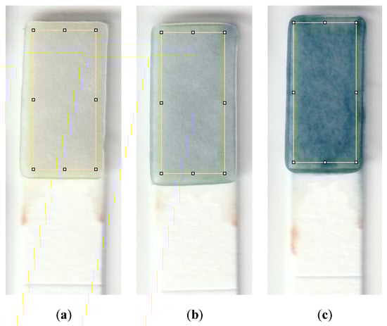 Figure 3. Detection zones showing the color that forms for a sample with a phosphate concentration of (a) 0.1 ppm, (b) 1 ppm, and (c) 10 ppm. The yellow rectangle is the region of interest utilized to quantify the color intensity using ImageJ; this area is 95 by 215 pixels, which is approximately 4 by 9 mm.