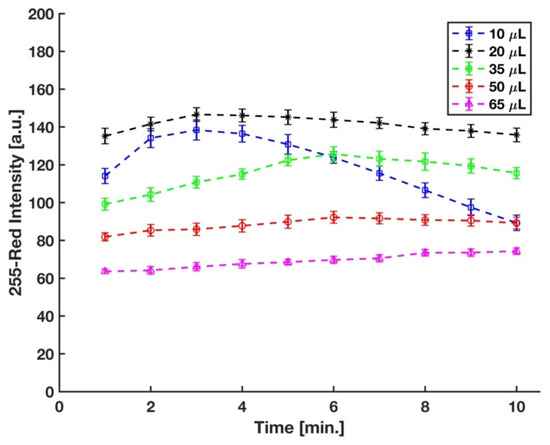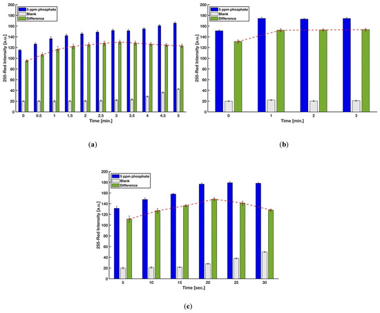 In the experimental setup, the sulfuric acid concentration was controlled by the volume of acid added to the micro vial. Acid concentration plays a significant role in the formation of the phosphomolybdenum blue, as well as its rate of formation. It has been well-established that a strong acid condition is needed to prevent auto-reduction of molybdenum in the absence of phosphate [24]. Different strong acids, such as sulfuric acid, hydrochloric acid, perchloric acid, and nitric acid, have been used in the molybdenum blue method for phosphate detection [40,41,42,43]. However, sulfuric acid has been mostly preferred in this method since nitric and perchloric acids (oxidizing acids) interfere with the reduction reaction of phosphomolybdenum acid [24,44], and the chloride ions in the hydrochloric acid hinder the development of the molybdenum blue complex [45]. Therefore, for this study, sulfuric acid was used, and the optimum volume of 3.6 M sulfuric acid in the final solution was determined by measuring the difference between the red intensity of complex developed on the detection zone of the device by the 5 ppm and 0 ppm (blank) phosphate samples at five different sulfuric acid volumes. We started with 50 μL sulfuric acid to have the same concentration of the acid in the final solution with Ref. [29]; however, as shown in Figure 6, the maximum sensitivity was reached with 20 μL of sulfuric acid.