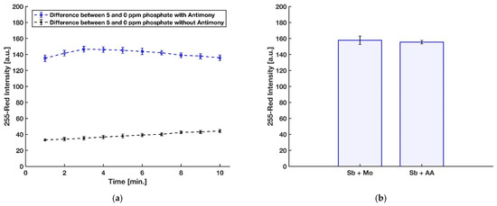 In a recent investigation by Divya et al. [45], in contrast with other reports, a negative effect of using antimony on the formation of molybdenum blue complex and its sensitivity for detection of phosphate was recorded. However, their 3 mL final reaction mixture was being heated for incubation at 100 °C for 20 min in order to further enhance the rate of the reduction. However, the heating process can cause some problems, including increasing the effect of silicon interference [48] as well as degrading the final molybdenum blue product [49]. To this end, the impact of Sb in the detection of phosphate for the present device was evaluated with three replications by comparing the red intensity obtained from the detection zone of the device with antimony dried on blotting paper along with ascorbic acid and the device without antimony on the reduction reagent dried on the detection zone. As shown in Figure 7a, Sb is needed to have a rapid formation with an intense color of the molybdenum blue on the detection zone. In addition, in the previously reported paper-based devices for phosphate detection [29,30,31,32], antimony was added to the acidic molybdenum reagent. Therefore, the effect of dissolving antimony with molybdate in DI water or mixing with ascorbic acid and using it as part of the reducing reagent was studied by comparing the blue color product formed on the detection zone with these two approaches, and the result can be seen in Figure 7b. For further study, a two-tailed t-test at 95% confidence level was applied to statistically compare the results obtained by the two procedures. Considering the critical t-value of 2.776 and the calculated experimental t-value of 0.707, no significant difference in the precision of the two methods was observed (p-value = 0.519, df = 4). However, a liquid reagent consisting of dissolved Sb with molybdate in DI water is not stable and is turned to turbid, presumably because of hydroxide salts [24].