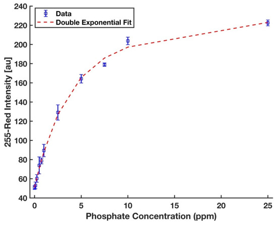 Figure 8. A double exponential calibration curve for phosphate solutions in the form y = a1 × exp (b1 × x) + a2 × exp (b2 × x), where a1 = 194.4, b1 = 0.006, a2 = −143.3, b2 = −0.286, and R2 = 0.997. The error bars represent the standard deviation of three measurements.