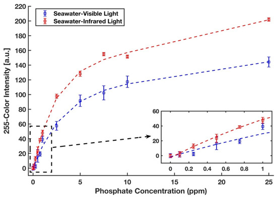 The phosphate detection efficacy of the device was also examined in a real seawater sample from the Sargasso Sea, which differs in both salinity and traces of ion content from DI water. Therefore, a completely randomized test order with three replicates was run for each concentration of phosphate sample in the Sargasso Sea seawater. The images of the detection zones were captured in the visible light conditions by the scanner and in the near-infrared zone by a recently developed infrared lightbox that is wirelessly controlled by a smartphone and communicates with it [39]. The red intensity color was selected for the analysis of the images taken by the scanner. The unweighted grayscale intensity was used to create the calibration curve for the images captured by the lightbox. Figure 9 represents the calibration curves with an inset plot for lower phosphate concentrations for the detection of phosphate in Sargasso Sea seawater in visible (blue) and infrared (red) illuminations in which all values were subtracted by a corresponding blank value. Calibration curves in the form y = a1 × exp (b1 × x) + a2 × exp (b1 × x) were generated, where a1 = 59.78, b1 = −0.345, a2 = 127.7, b2= −0.024, and R2 = 0.992 for the visible light and a1 = 51.83, b1 = −0.525, a2 = 83.33, b2 = −0.009, and R2 = 0.995 for the infrared light. The limits of detection and quantification for phosphate with visible illumination are 0.438 ppm and 1.961 ppm, respectively. By using the portable infrared lightbox, the device would not only be a fully portable and field-deployable one, but it can also detect phosphate in the lower concentrations as limits of detection and quantification in the infrared zone are 0.156 ppm and 0.769 ppm, respectively. This accounts for an enhancement in sensitivity by a factor of three and is due to the fact that the maximum absorption of the molybdenum blue occurs in the infrared region of the spectrum (around 850 nm) [53].