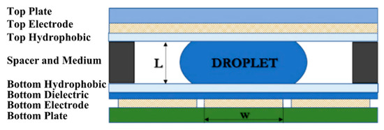 The size of the bottom electrode w and the spacer distance L between the top plate and the bottom plate in Figure 1 are critical parameters and are strongly related to the minimum size of the liquid droplets that the designed EWOD device can manipulate. The equation relating the controlled droplet volume to the electrode size w and the distance between the plates L can be described by the modified volume of a cut sphere, as described in Equation (1)