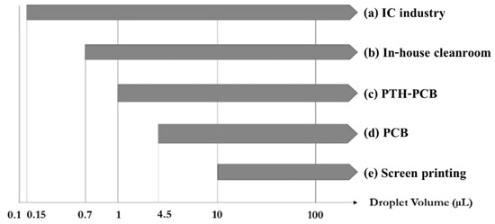 Possible droplet volume according to fabrication techniques. (a) R. Malk et al., (2011) [30]; (b) Jie Gao et al., (2015) [31]; (c) Chunqiao Li et al., (2018) [32]; (d) Vandana Jain et al., (2015) [33]; (e) M. Yafia et al., (2014) [3].