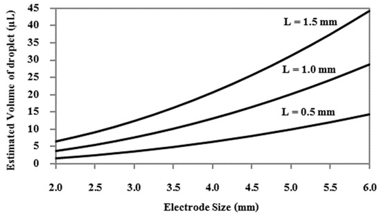 where Vf is the volume of liquid droplets in a closed-type EWOD [mm3], w is the size of the bottom electrodes [mm] and L is the distance between the top plate and bottom plate [mm]. Figure 5 shows the volume of the controlled liquid droplets according to the size of the electrode w at the specified distance L. In this work, the spacer distance L was fixed at 1 mm, because non-conductive material with a thickness of 1.0 mm, such as a glass slide, was available. The electrode sizes (w × w) are 2.0 × 2.0 mm and 5.5 × 5.5 mm. The gap between two adjacent electrodes must be as small as possible, depending on the fabrication technique, i.e., for the plated-through-hole print circuit board (PTH-PCB) fabrication technique, the gap size is limited to 0.15 mm. These electrode dimensions allows the EWOD device to control the minimum volume of droplets at the approximated sizes of 3 µL and 24 µL, respectively.