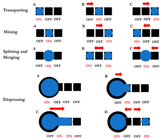 Closed-type EWOD devices provide the ability to transport, mix, split, merge, and dispense droplets, as shown in Figure 6. The number of electrodes required for mixing, splitting, and merging are three adjacent electrodes, while the number involved in the droplet dispensing process is four adjacent electrodes, including a reservoir electrode. During droplet transportation, electrical potential is applied to the adjacent electrode in the transporting direction. Similarly, electrical potential is applied to array electrodes in the back-and-forth direction at high switching frequency to shake and to homogenously mix droplets. When electrical potential is applied to the frontal and backward electrodes simultaneously and equally, the droplet can be split in half. Merging can be achieved by applying electrical potential to the electrode situated between two droplets. Dispensing is more complicated than the other droplet manipulation processes. Firstly, the droplet must be drawn out of the reservoir by applying electrical potential to three adjacent electrodes, as shown in Figure 6; later, the electrical potential applied to the two middle electrodes must be removed while maintaining the applied electrical field on both the reservoir and the end electrode in order to cut the droplet. The size of the dispensed droplet depends on the electrode size and the gap between the top and the bottom plates in Equation (1).