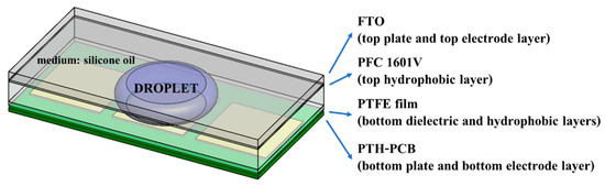 The spacer layer of the EWOD device was created by using a thin-film layer with 1 mm thickness, placed around the rim of the bottom EWOD plate to create a 1 mm distance between the top plate and the bottom plate, according to the proposed design in Section 2. Later, silicone oil was used as a medium to fil the void space and to prevent the sample droplets from breaking down during droplet manipulation or evaporating during endothermic testing under heating conditions. Silicone oil also helps to maintain the sample temperature under isothermal conditions during the DNA amplification process.