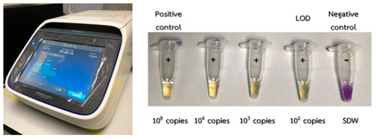 Typically, the LAMP method was performed in a thermal cycler (Applied Biosystems™: SimpliAmp™ thermal cycler), in which thermal cycling for DNA/RNA amplification could be adjusted to provide isothermal DNA/RNA amplification according to the specified testing procedure. For EMS detection, 110-μL LAMP–XO premix and 5-μL Bst polymerase must be homogenously mixed in a vortex mixer and a centrifuge for 10 s. The mixed compound was then placed in 5 microtubes, each containing 23 μL of the substance. During the sensitivity validation test, carried out in order to observe the limit of detection (LOD), the 2-μL EMS DNA plasmid samples with concentrations of 0 copies, 102 copies, 103 copies, 104 copies and 108 copies were added to each microtube. The 0-copy EMS DNA plasmid sample was used as the negative reference and could be prepared using SDW. The microtubes were then placed into a vortex mixer and a centrifuge to guarantee homogenous conditions prior to being placed in a thermal cycler. In the thermal cycler, DNA/RNA amplification was maintained at 64 °C for 75 min. After the isothermal amplification process, the color of the positive samples supposedly turned from violet to yellow, as shown in Figure 15. The sensitivity of EMS detection by the standard LAMP tests was limited to 102 copies, in agreement with the work carried out in [29].