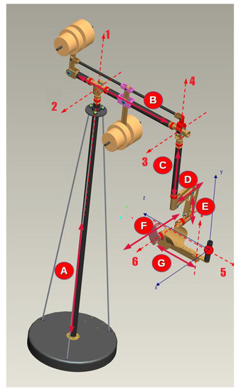 Track-Hold axes. The length of arm A (identified by a number inside a red circle) is about 2200 mm, arm B is about 1200 mm, arm C is about 1000 mm, arm D is about 250 mm, arm E is about 250 mm, arm F is about 250 mm, and G is about 250 mm.
