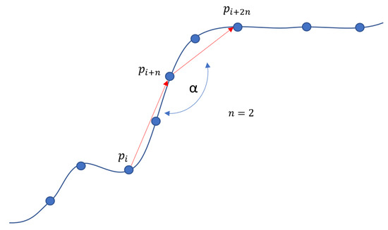 - Transformation of the array of coordinates into an array of angles : in practice, after having selected a step n of the order of some units, the path is scanned progressively, choosing three points , , at each time (Figure 6). However, not being periodic, these angular variations will not be particularly present in the frequency analysis.