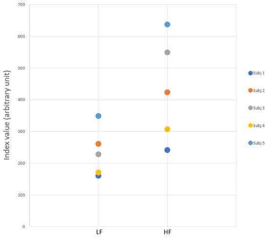 A typical dispersion of the average values of the LF/HF indexes for the 5 subjects, on task 1.