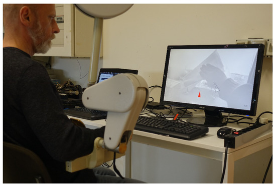 Track-Hold allows to record kinematic data during therapy sessions and, among many applications, estimate daily improvements and progress in the therapy program. Seven rotation sensors enable monitoring the device’s mobile joints’ movements, having an accuracy of about one-tenth of a degree (Figure 2). The device’s manipulator, consisting of a handle, is equipped with a pressure sensor (useful, for example, for detecting the gesture of picking up objects). The sampling rate of the positions is 100 Hz, which is largely sufficient for correct motion detection. The device is connected to a computer using Universal Serial Bus (USB).