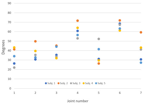 The figure shows for each subject (represented by the colored balls) a typical maximum angular excursion of the seven joints (numbered as in Figure 2). Subject’s, in degrees, for each of the 7 joints.