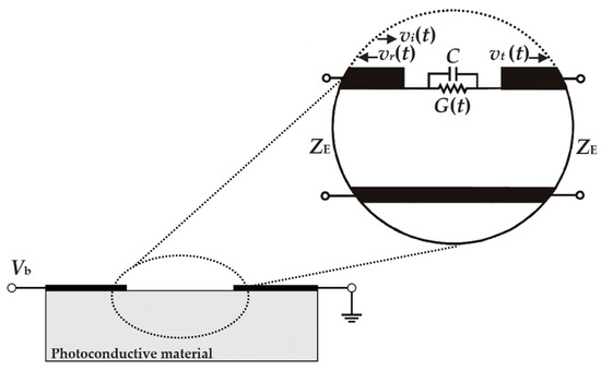 The functioning of a PC THz emitter can be understood in terms of charge carrier transport in its PC material, due to the acceleration of the photoexcited charge carriers, and charge redistribution on its electrodes, as voltage on the electrodes varies to accommodate the evolving electric field in the PC gap. These effects can be modelled by a conduction current, according to a time-varying gap conductance of G(t), and a displacement current, as defined by a gap capacitance of C, respectively. Such a construct leads to the equivalent circuit of a PC gap shown in Figure 1 with a bias voltage of Vb and a parallel connection of its conductor and capacitor. For the conduction current, the photoexcitation yields a time-varying conductivity of