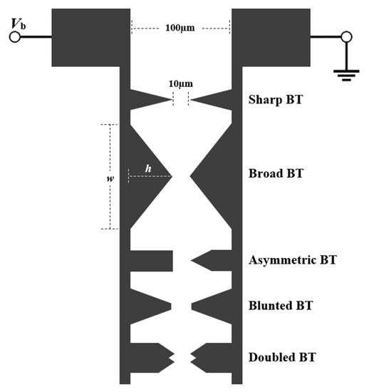 The PC THz emitters analysed in this work were fabricated via sputtering as Cr/Au metallization at a thickness of 25/75 nm. Conventional photolithography was then used to pattern the metal via bilayer lift-off with a mask aligner (OAI Model 204). The structures were implemented with a fixed 10-µm PC gap and a fixed 100-µm outer spacing between the two electrodes in the form of Sharp BT, Broad BT, Asymmetric BT, Blunted BT, and Doubled BT antenna structures, as shown in Figure 2. The fabricated BT antennas were characterized using an SEM system (Tescan Mira 3 XMU Scanning Electron Microscope) with Backscattered-Electron (BSE) imaging, at 1000× magnification and 20.0 kV.