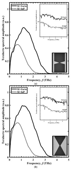 Results for the THz spectral amplitude as a function of frequency, f, are shown in Figure 4 for the BT antennas with (a) Sharp BT and (b) Broad BT antenna structures. The spectra are given for SI-GaAs (black line) and SI-InP (dotted line) as the PC material, with the THz spectral amplitudes shown on a log scale in the upper insets and the scanning electron microscope (SEM) images of the structures shown in the lower insets. Each structure can be envisioned as two isosceles triangles, with their tips meeting at the PC gap, where each triangle has a base width of w (the longest dimension of the triangle) and an overall height of h (from the tip to the electrode). Thus, the Sharp BT and Broad BT structures have height-to-width ratios of h/w ≈ 1.8 and 0.28, respectively, at roughly a factor of six difference. For the Sharp BT structure, with SI-GaAs and SI-InP, the (maximum normalized) THz field amplitudes are 0.66 and 0.49 respectively, and the bandwidths are 3.4 and 2.5 THz, respectively. For the Broad BT structure, with SI-GaAs and SI-InP, the (maximum normalized) THz field amplitudes are 0.83 and 0.62, respectively, and the bandwidths are 3.5 and 2.6 THz, respectively. The results show that the Broad BT has a larger amplitude and bandwidth compared to the Sharp BT. The improvement of the radiated THz field with respect to BT antenna dimensions was reported by Yang et al. [18] when the authors found a correlation between BT tip-length and the radiated THz field strength and bandwidth. We attribute this to the greater photocurrent in the transverse direction of the Broad BT, which results in a larger amplitude. The bandwidths resulted from these two structures are related to the broader THz pulse width as described by Tani et al. [16]. The improvement of the bandwidth is associated with the smaller capacitance of the Broad BT over the Sharp BT, which results in a shorter τRC according to (2) and producing shorter THz pulse durations and ultimately wider bandwidth.