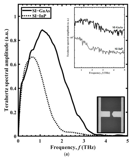 Photoconductive THz emission was introduced by Auston et al. several decades ago [5] and since then many studies have put it to use [6,7]. The THz radiation is formed by a PC THz emitter when an ultrashort laser pulse with above-bandgap photon energy is incident upon its biased PC antenna, causing the photoexcited charge carriers to accelerate under the bias field [8]. The characteristics of the emitted THz radiation rely heavily upon the PC THz emitter’s features—and so there is an ongoing struggle to understand the photoexcitation process and optimize the emission. This is often done with thought to the PC THz emitter’s material and structure. The PC material for the THz emitter will ideally have a high carrier mobility, high breakdown voltage, and suitable bandgap for the pump laser’s photon energy [8]. A variety of semiconductors have been considered for this PC material, including InAs [9], InGaAs [10], GaSb [11], GaNAsSb [12], and the semi-insulating (SI) forms of GaAs [13] and InP [14]. The antenna structure has also been found to influence the PC THz emission. Specifically, the polarization dependence from different structures has been found to yield differing electric field components, which impacts the direction of charge carrier transport and the effectiveness of PC THz emission [15]. Various antenna structures have been studied in the past―and progress has been made in optimizing these structures for PC THz emitters [16]. However, such studies have also found that the characteristics of PC THz emission from the differing structures are impacted by the underlying PC material.