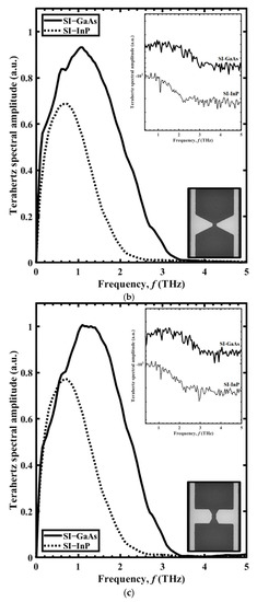 The overall results for the THz bandwidth of the all PC THz emitters are shown in Figure 6b. Notably, all the obtained results exhibit a wider bandwidth of SI-GaAs over SI-InP. We attribute this difference (again) to the greater mobility of SI-GaAs. The greater mobility increases the conductivity in (1), and thus the conductance, G(t), which reduces the τRC in (2).