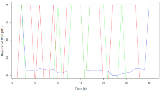 Beacons’ RSSI: beacon1 (red), beacon2 (green), and beacon3 (blue).