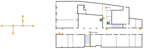 Starting from the map of the floor, we have defined a graph G = (V, E) where V are all the turning points and the ends of the corridors and E represents the set of edges that connect such vertices. As turning points are considered also the stairs and the elevators. The resulting graph of the ground floor is portrayed in the leftmost part of Figure 3 while in the rightmost part is reported the correspondent beacons deployment. This is the minimum quantity of beacons needed to develop a navigation system.