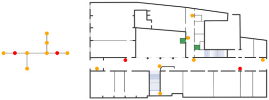 The second part of the procedure consists of associating the POIs to the beacons in the graph. In our system, each POI is associated to one and only one beacon. Instead, a beacon can be associated to zero or N POIs. All the POIs, that are within the range of a beacon, are simply associated to it. However, it is possible that some POIs are not associated to any beacon. In these cases, new beacons have to be introduced so that, in the end, each POI is associated to a beacon. Obviously, the graph changes accordingly, with a new node for each new beacon. The updated graph of the ground floor is reported in the leftmost part of Figure 4. The red points are the nodes added to be able to map some POIs that were not associated to any beacon. In the rightmost part, instead, there is the corresponding beacons deployment.