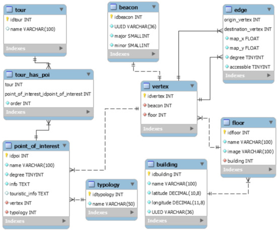 In Figure 5, we reported the entity-relationship model of AlmaWhere. Each building is characterized by the name, geographical position, and UUID. The building has one or more floors, each of which contains the image of the map that will be shown when the user is on the specific floor. With regard to the navigation graph, there are two main entities: vertexes and edges. Even if the vertexes coincide with the beacons, we kept them in separate tables as the positioning of the beacons inside the building may be subject to changes based on maintenance operations. The beacon contains the UUID, the major, and the minor while no additional information is associated to the vertexes. The edge, instead, connects two vertexes. Even if each edge is bi-directional, it is stored on the database considering one single direction, with the aim of saving space. Together with the origin and the destination nodes, four other pieces of information are saved: the coordinates (x,y) of the map portion relative to such edge, the degree of difference between the origin and the destination node, which is used to indicate in which direction the user must move (i.e., go ahead/back, turn right/left), and a boolean specifying that such edge is accessible to people with mobility impairments or not. As already stated, zero or N POIs can be associated to a vertex. A POI has the following attributes: name, degree, info, touristic info, and typology. Finally, there are tours, that essentially include ordered lists of POIs.