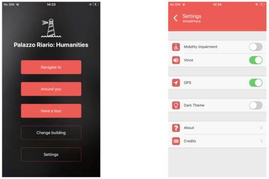 Once the building has been identified, the homepage, reported on the leftmost part of Figure 6, is shown. It is composed of a title, containing the name of the building, and of five buttons: the first three ones are related to the three main functionalities of the app, the fourth one allows us to change the building, while a tap on the last one open the settings, whose screen is depicted in the rightmost part of Figure 6.