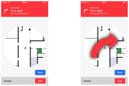 This functionality takes care of leading the user from his/her current position to a specific destination, chosen from the list of POIs of the building. First of all, the graph is created using the information about the building. Then, the route is computed with Dijkstra’s algorithm, using the library node-dijkstra (https://github.com/albertorestifo/node-dijkstra, Accessed on 23 February 2020). Once the path is computed, the navigation starts, showing the Navigation UI, reported in Figure 7. It is divided into three sections. The top one contains the next indication to follow. In the center, there is always the portion of the map relative to the edge that the user must travel. Its orientation varies according to the device compass. If there are POIs associated to it, the button “Near” is shown. The bottom bar, instead, contains the buttons “Details” and “Exit”.