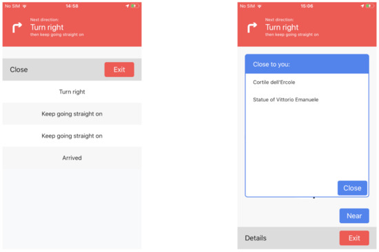 At any time of travel, the user can tap on one of the three buttons. The bottom “Exit” simply interrupts the navigation, showing the homepage. The “Details” one shows a sliding panel containing the list of all the indications to reach the destination, also depicted in the leftmost part of Figure 8. “Near”, instead, opens a pop-up with the list of the nearby POIs (i.e., the ones associated to the last sensed beacon). The user can view any cultural information of a POI by clicking on its name, without interrupting the navigation that continues in the background.