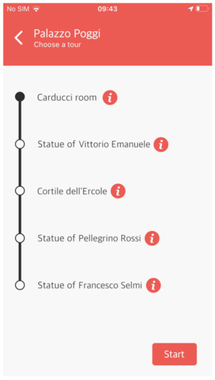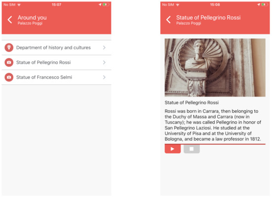 The list of nearby POIs, which are flanked by an icon that indicates whether or not they have a historical value, is reported on the leftmost part of Figure 9 while in the rightmost one, it is depicted the details of a particular POI belonging to the historical Palazzo Poggi (the headquarters of the University of Bologna and of the rector of the university), that is the Pellegrino Rossi statue. The details consist of a photo, a title, and a description, that can be vocalized by the Text-To-Speech.