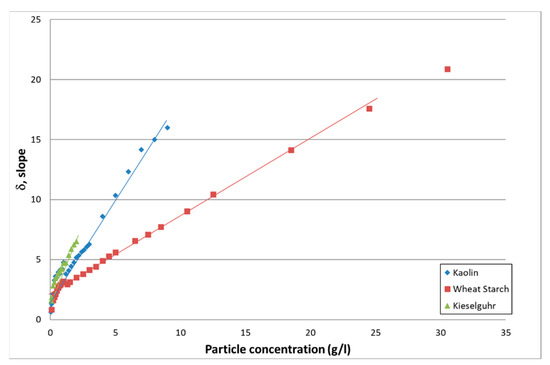 As can be seen in Figure 5, particularly for kaolin, the value of the slope, thus the intensity of the acoustic signal, slightly decreases due to excessive attenuation at high concentration. However, for all particles, the linear regression analysis was performed on the entire concentration domain.