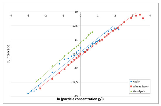 The behavior of the intercept as a function of the particle type and concentration is given in Figure 6. Again, a linear regression of the intercept accordingly to γ = ai ln M + bi was carried out on the data. The results are given in Table 4.