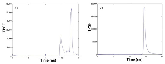 The TROT waveform is given by the temporal point spread function of the emission pulse. A shown in [24], the TPSF will depend on the absorption and diffusion properties of the illuminated medium. Given Equation (4), we plotted in Figure 7 the normalized Green function for an infinite medium defined by its refractive index n = 1.33, pure water, µa = 0.005 mm−1, µs’ = 0.6 mm at a distance of r = 13 mm from the source [28]. The number of photons collected by our TROT system is supposed to have the same shape as the TPSF shown Figure 7.